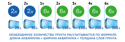 • Рассчитайте необходимое количество грунта по формуле: длина х ширина аквариума х желаемая высота слоя. Например: 40 х 30 х 5 см = 6000 мл. = 6 л. Таким образом, понадобится 1 упаковка 6 литров или 3 упаковки по 2 л.